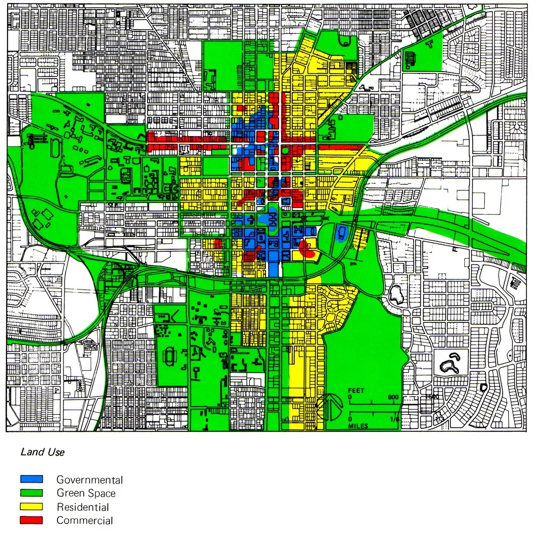 Separation of uses. Wide streets for cars. Minimum parking requirements. Buildings needed to be set back from streets. Height limits and floor-area ratios favored simple geometries.